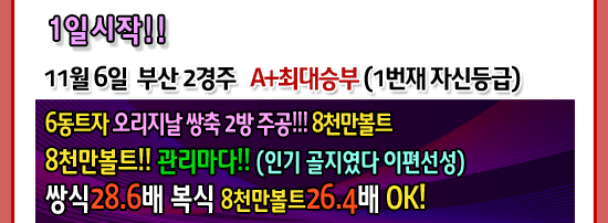 11¿ù 6ÀÏ ÀÏ ºÎ»ê ¼ºÀû! 11¿ù 6ÀÏ ±Ý ºÎ»ê±³Â÷ 2°æÁÖ A+ÃÖ´ë½ÂºÎ (1¹øÀç Àڽŵî±Þ) 6µ¿Æ®ÀÚ ¿À¸®´Ï³¯ ½ÖÃà 2¹æ ÁÖ°ø!!! 8õ¸¸º¼Æ®½Ö½Ä 28.6¹è º¹½Ä 26.4¹è OK!!